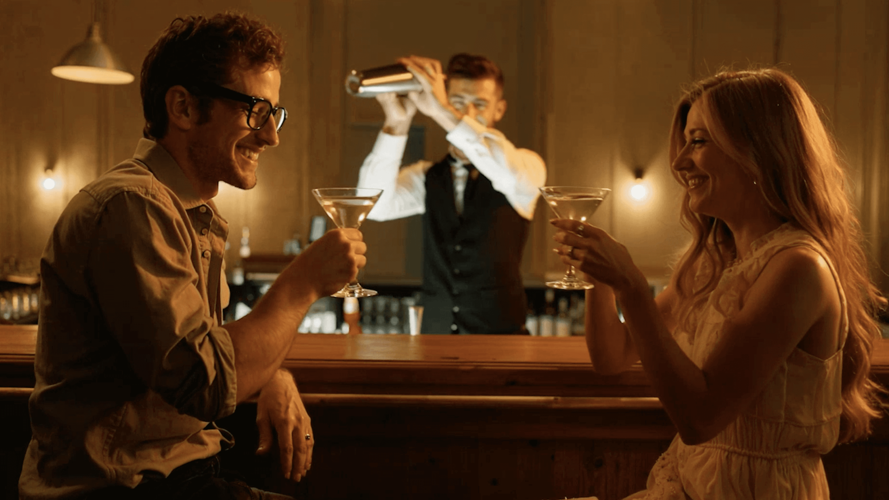 A couple on a date in a cocktail bar with no bartender — they must make the drinks themselves and immediately spill them, making the moment awkward rather than romantic.